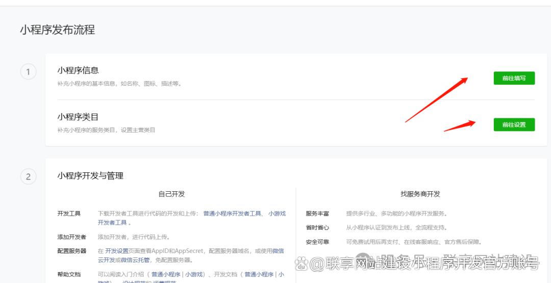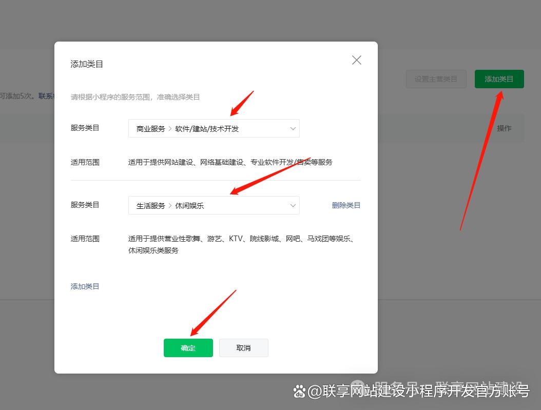 2)小程序类目添加,根据小程序服务内容结合开发服务类目链接,添加: