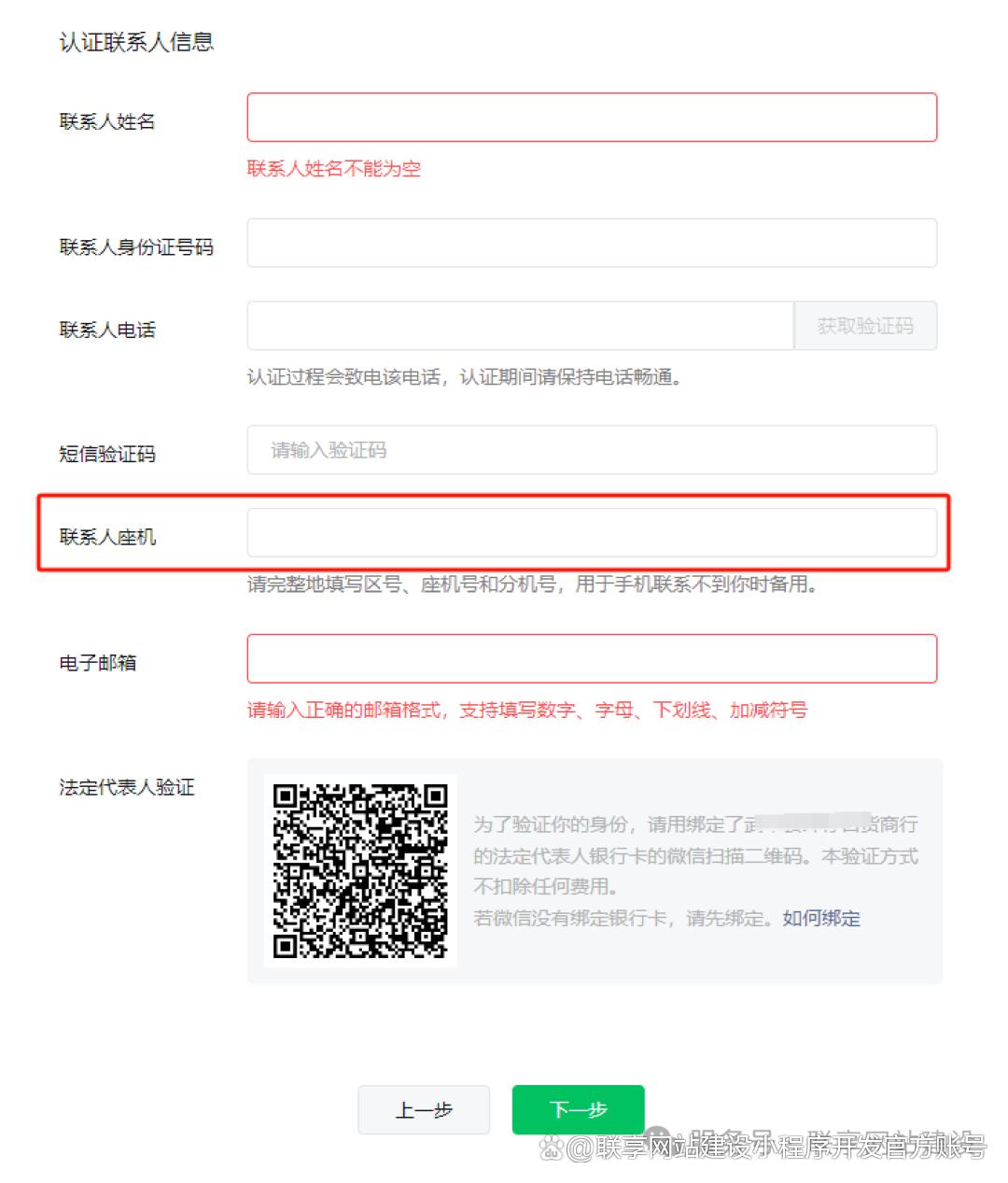 5、上传营业执照,系统会自动识别填写营业执照信息。然后继续填写营业执照的认证联系人电话、邮箱、座机电话号码是必填。