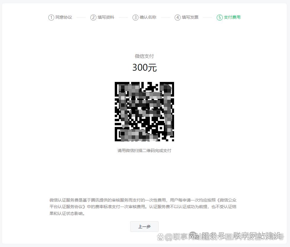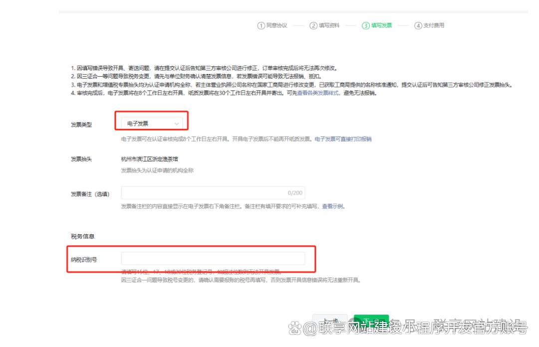 6、点击下一步,进入最后环节,填写发票信息,纳税识别号(营业执照上的统一社会信用代码)支付认证审核费用300元,提交后注意接听认证审核电话。