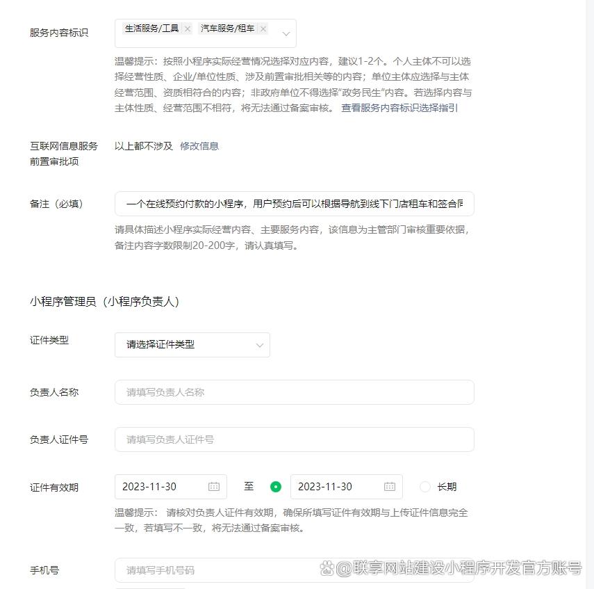 4、服务类型标识一般选1个,选择默认的,对于普通行业的前置审批选项,点开下拉选择“以上都不涉及”,备注说明(必填)小程序类型、功能和作用。