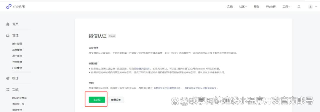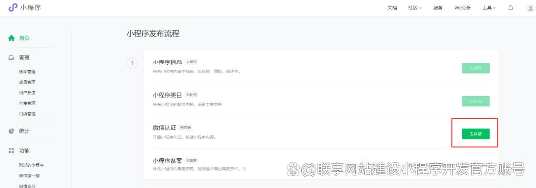 1、进入初始状态的后台,会出现两个不可点击的绿色按钮(小程序信息和小程序类目)和一个可点击的绿色按钮(微信认证),首先点击“去认证”。