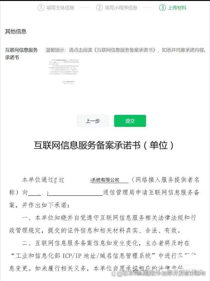 5、继续下一步,浏览《互联网备案信息服务备案承诺书》下载打印,签字,签署日期,盖公章,拍照或扫描上传,点击提交备案审核。