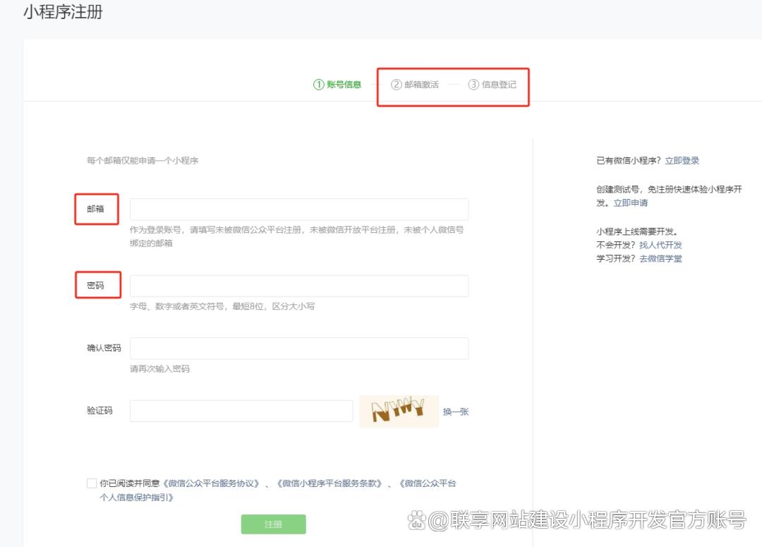 一、申请微信小程序账号: