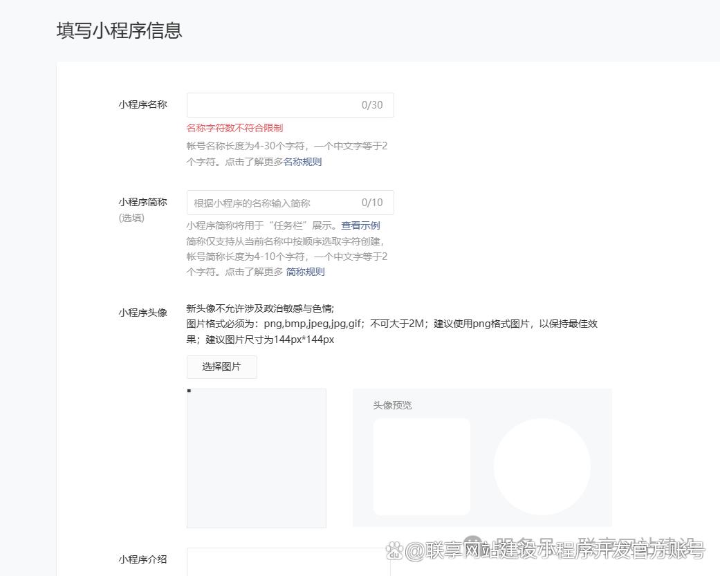 1)小程序信息需要填写,小程序名称(一年可以修改2次)、简称(一年可以修改2次)、头像(一年可以修改5次)以及小程序介绍