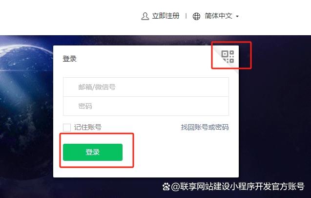 6、邮箱激活以后,会直接跳转页面到小程序初始页面的填写信息后台,但有时候无法回到继续填写的界面,这个时候可以返回到微信公众平台的登录注册界面,点击二维码右上角“使用账号密码登录”。
