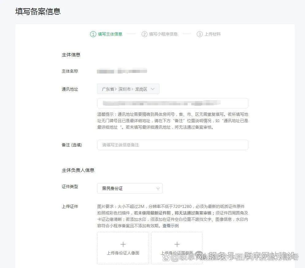 3、填写主体信息——录入营业执照登记的地址、营业执照的法人信息,包含2个手机号(法人手机号和应急手机号)和1个邮箱账号。