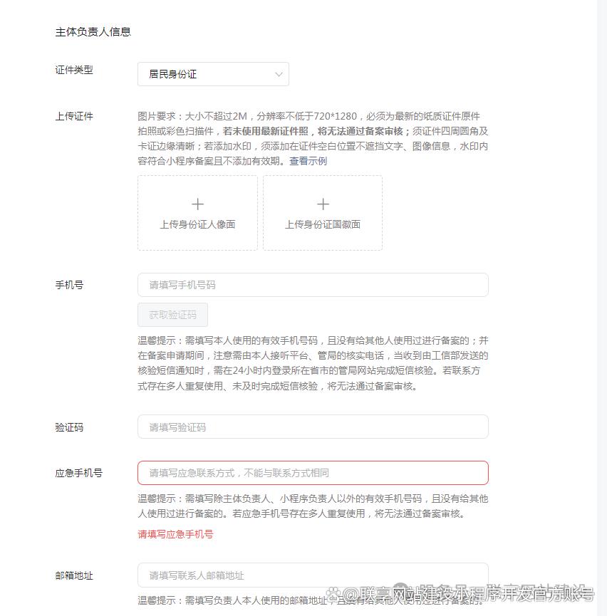 小程序管理员(小程序负责人):包含2个手机号(管理员手机号和应急手机号,且应急手机号不能和主体负责人的应急手机号一致,具体看提示)和1个邮箱账号。