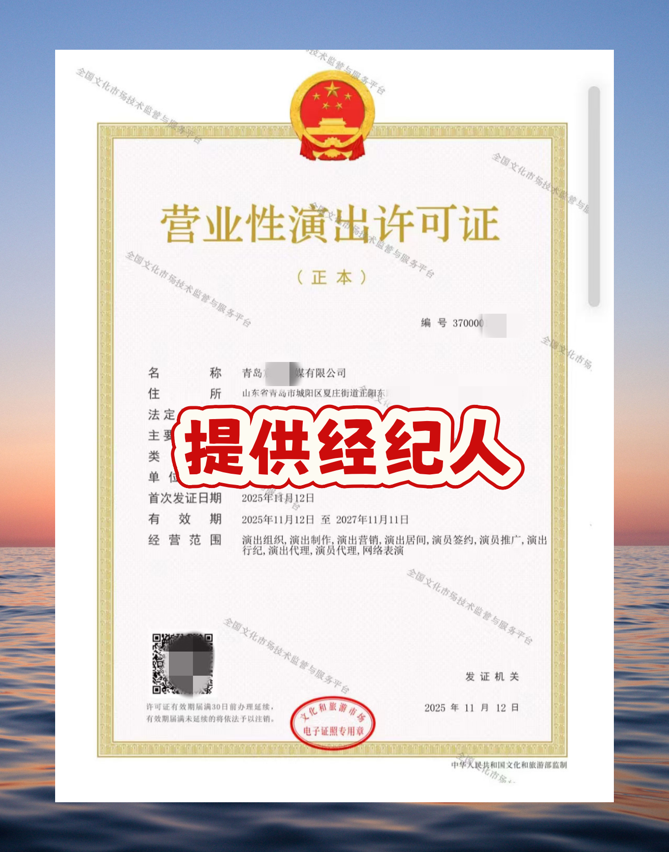 4、领取许可证:审核通过后,颁发《营业性演出许可证》,可选择现场自取或快递送达。