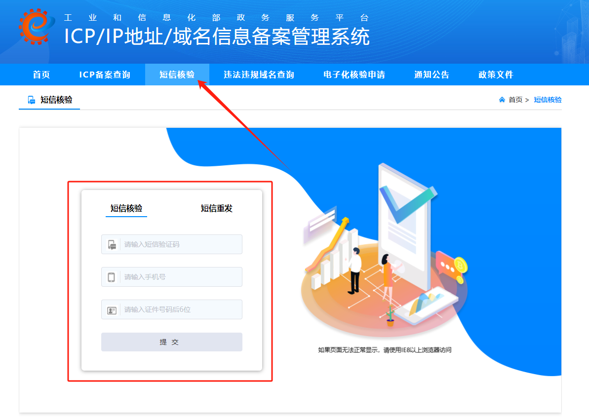 域名服务商审核完毕后,会提示你进入工信部的ICP/IP地址/域名信息备案管理系统进行短信验证,访问后点击顶部短信验证,填写手机号、验证码、证件号即可。